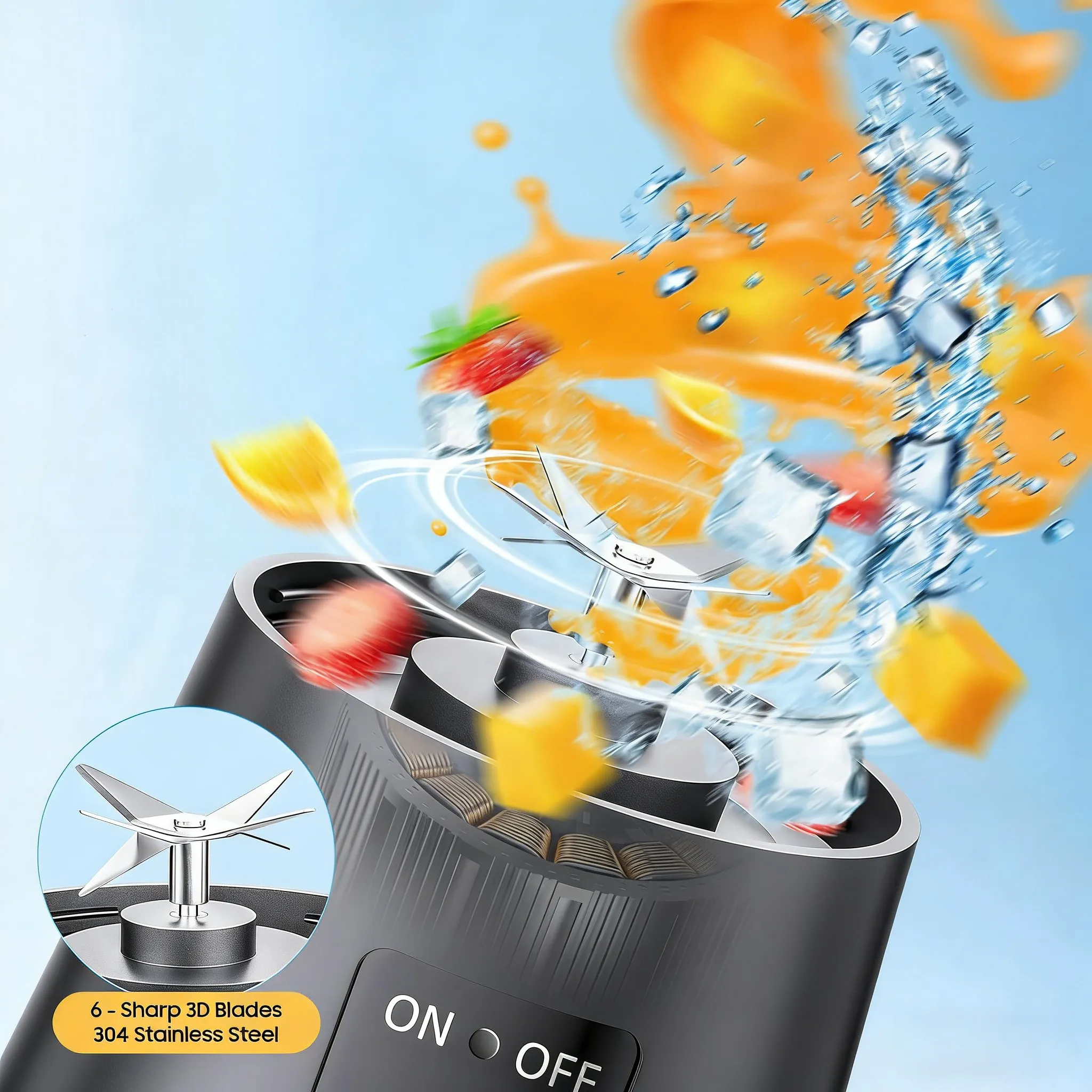 The Klynn Portable Blender Juicer Cup features a high-speed motor and 6 upgraded 304 stainless steel blades, spinning up to 20,000 RPM to effortlessly cut through fruits, vegetables, and more. This powerful blade system ensures smooth, even blending for perfectly mixed drinks every time.