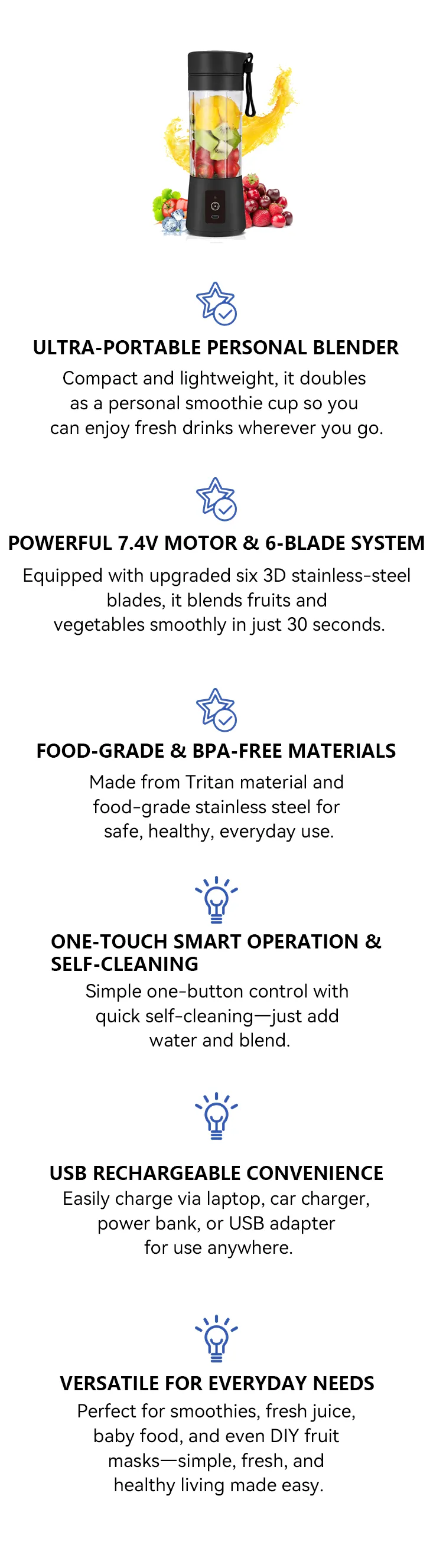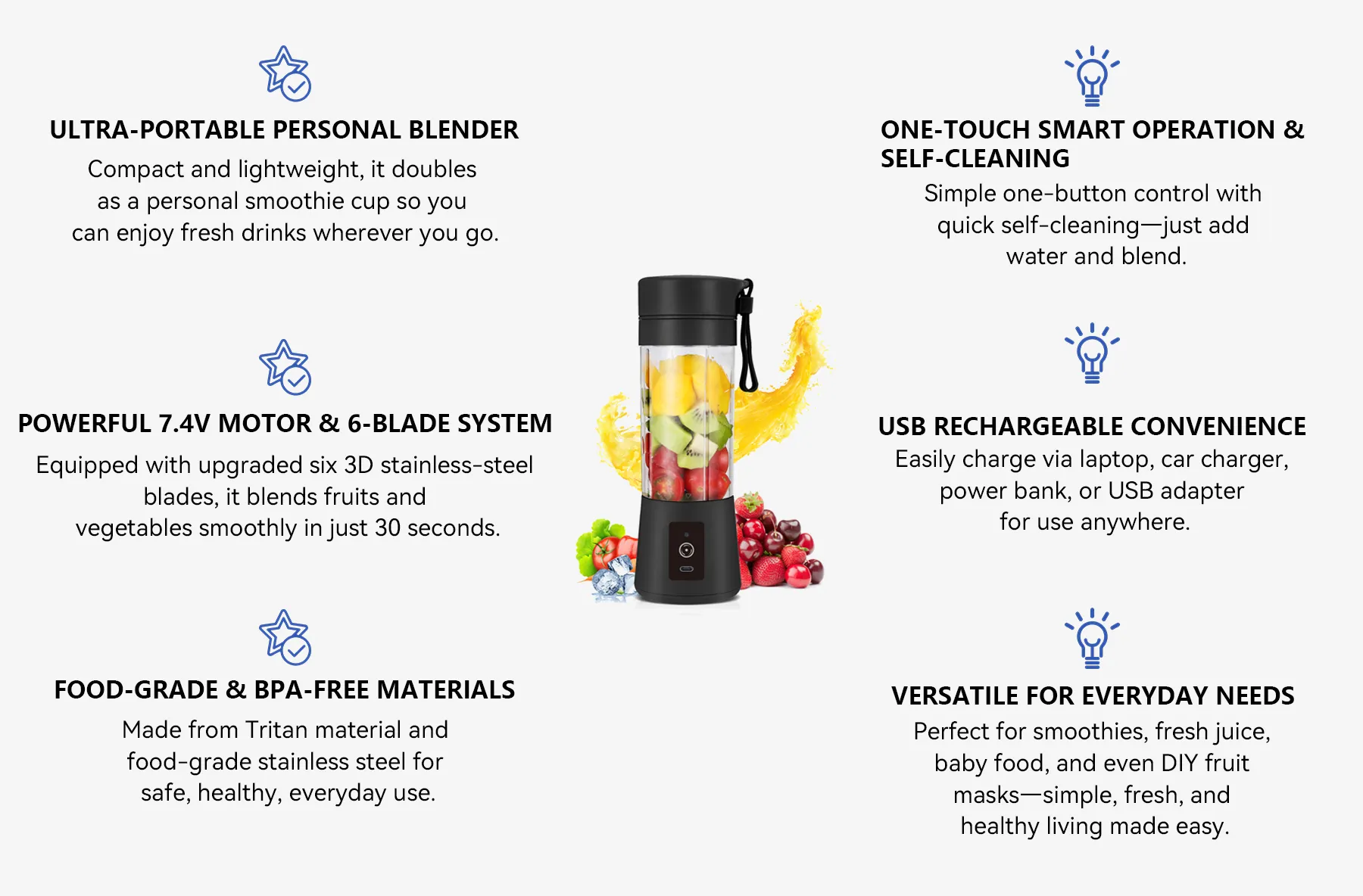 - Powerful 7.4V Motor – Blends fruits and ice quickly with upgraded performance.